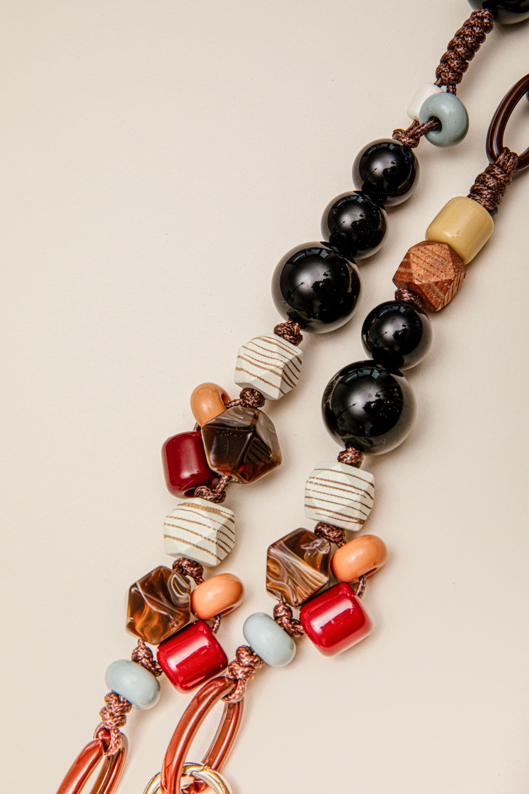 Cadena con eslabones de resina y piedras irregulares con herrajes dorados. Largo de 120 cm.