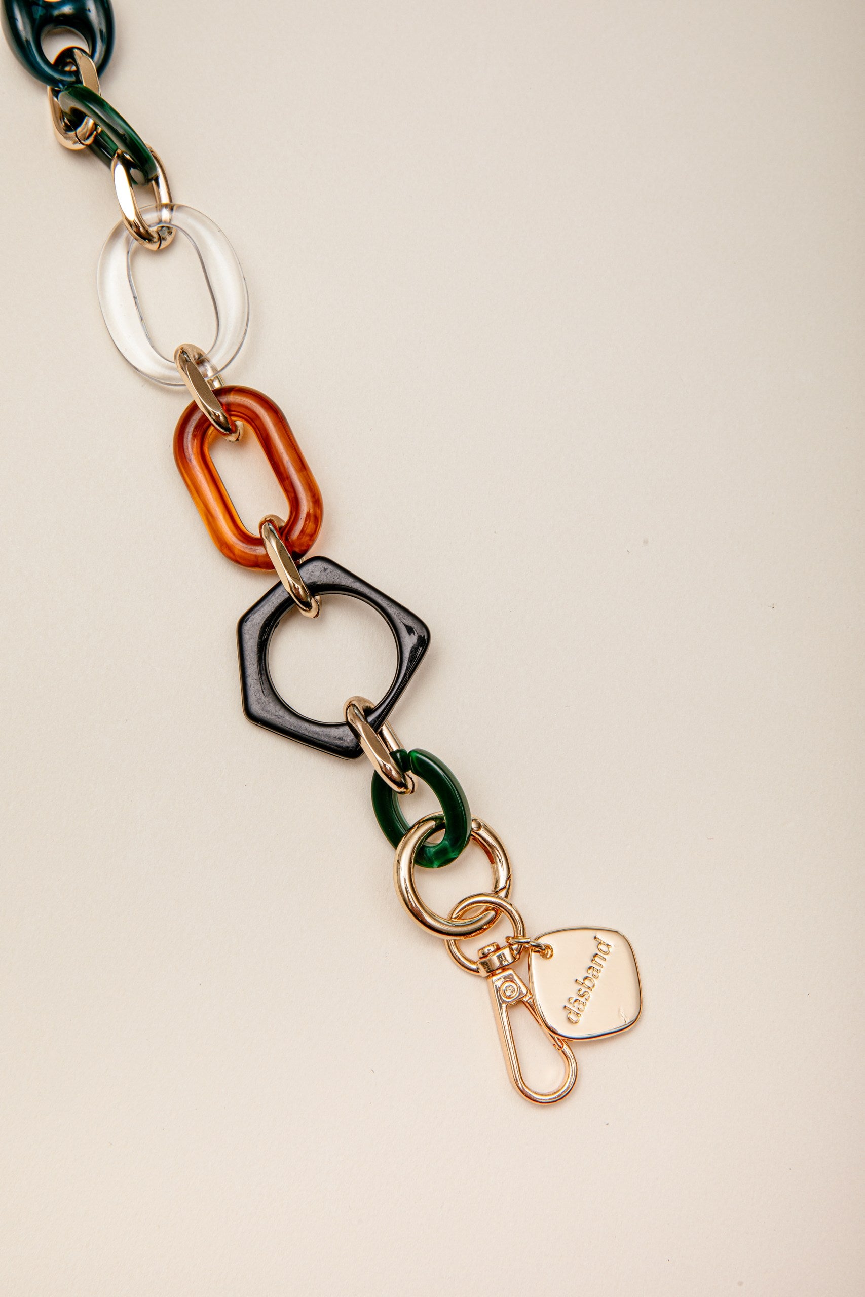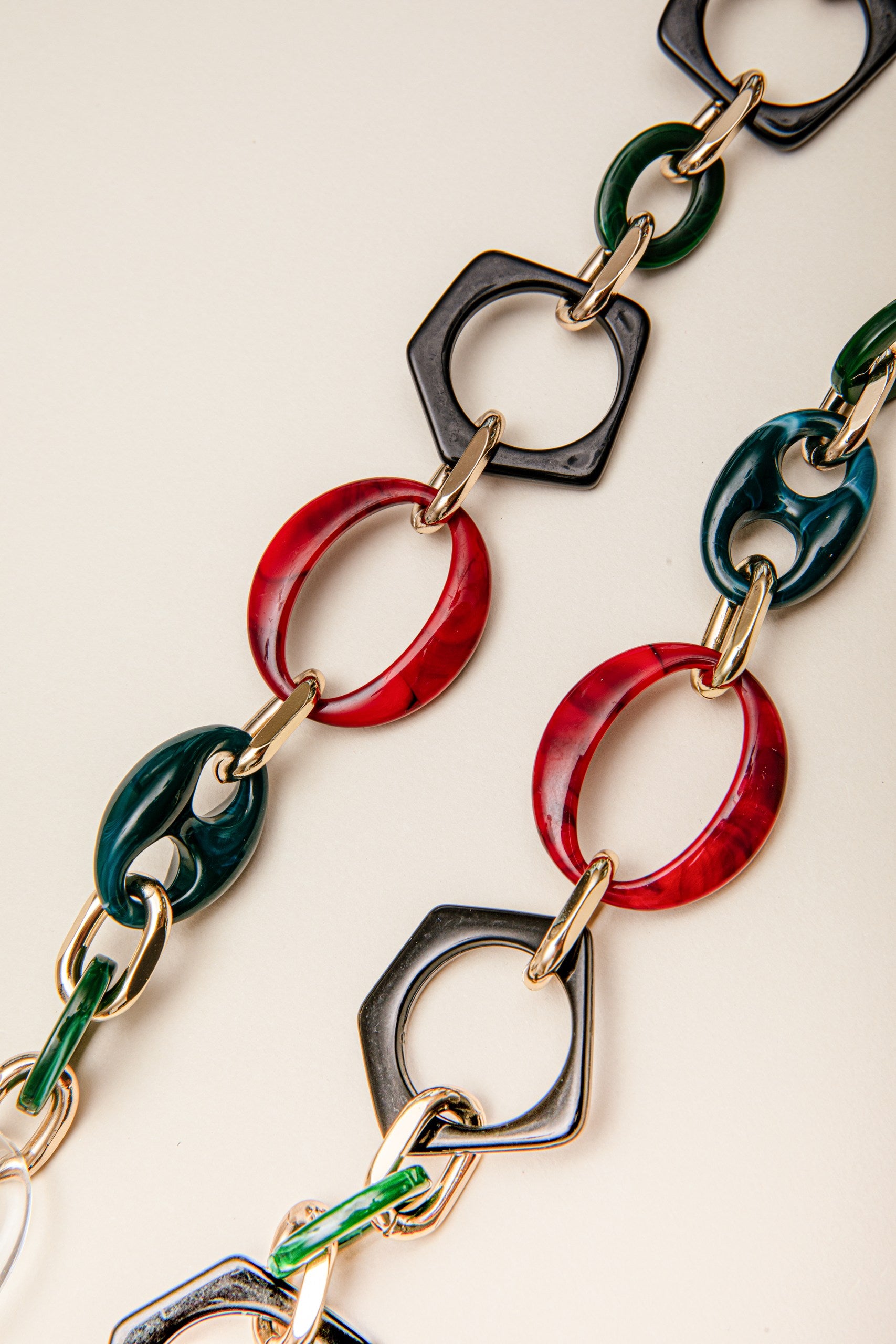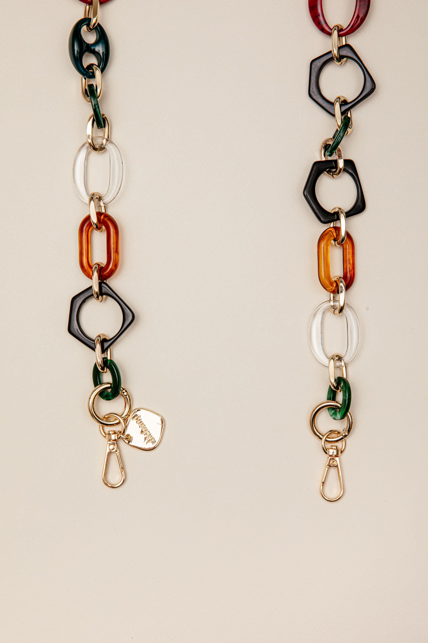 Cadena con eslabones de resina de diferentes formas y colores con herrajes dorados. Largo de 120 cm.