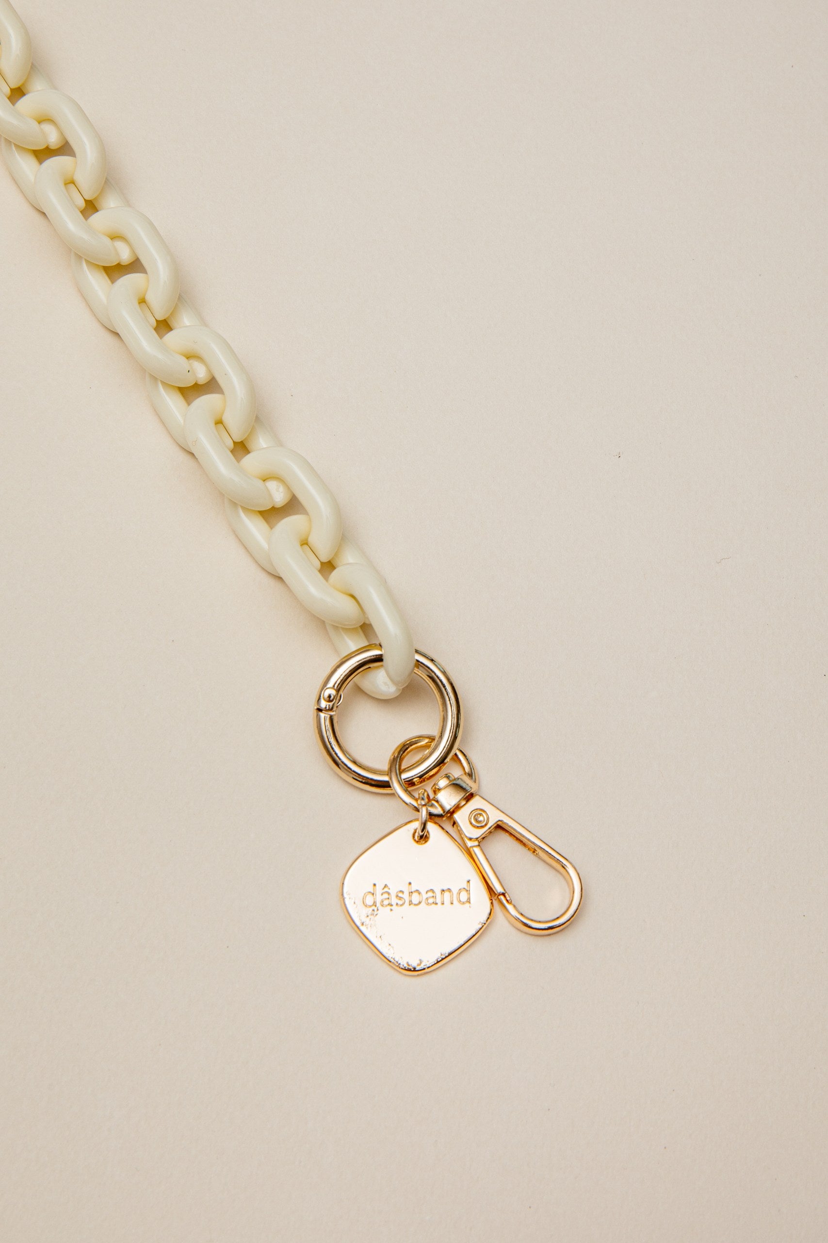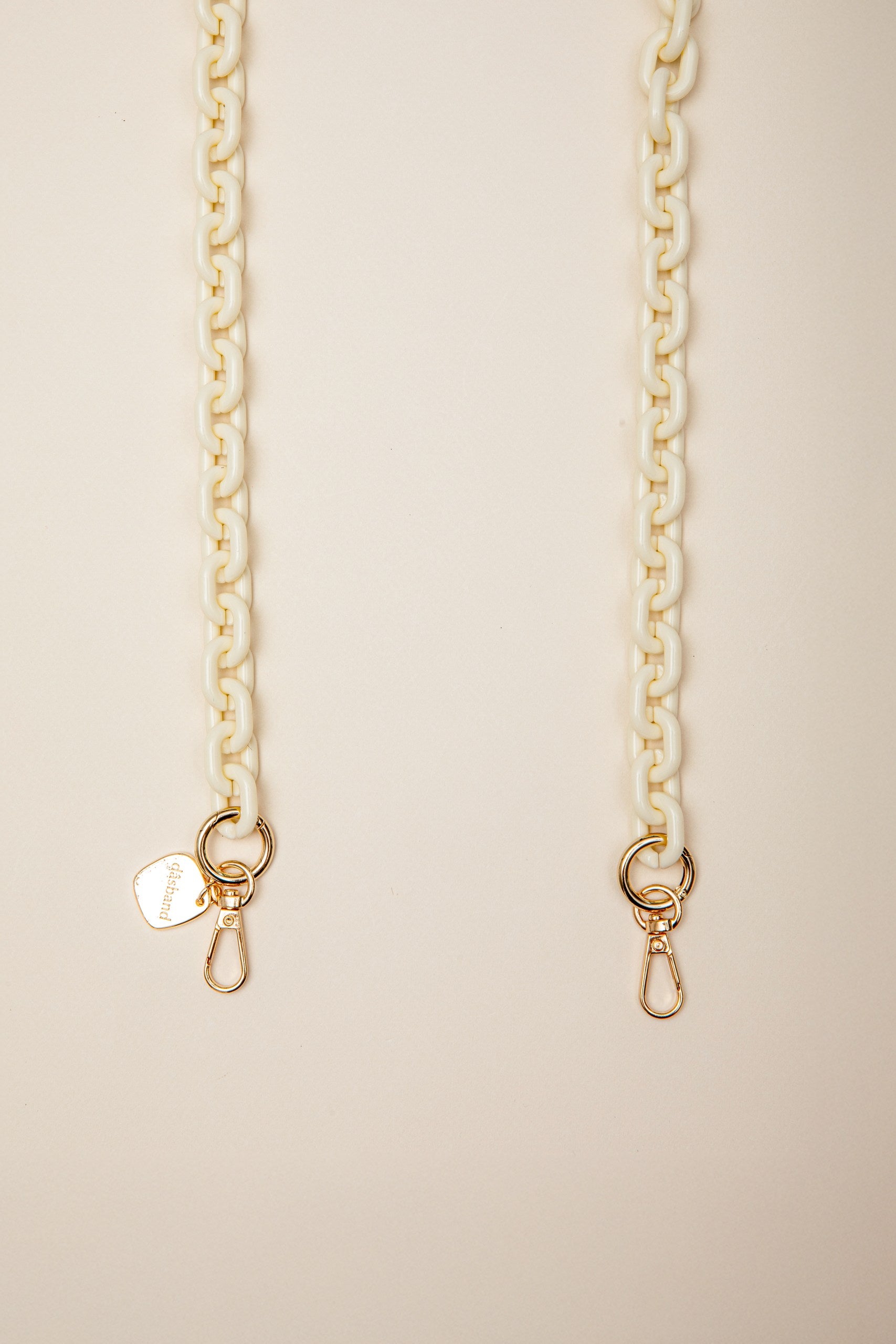 Cadena con eslabones de resina pequeños blanco marfil terminación satinada con herrajes dorados. Largo de 120 cm.