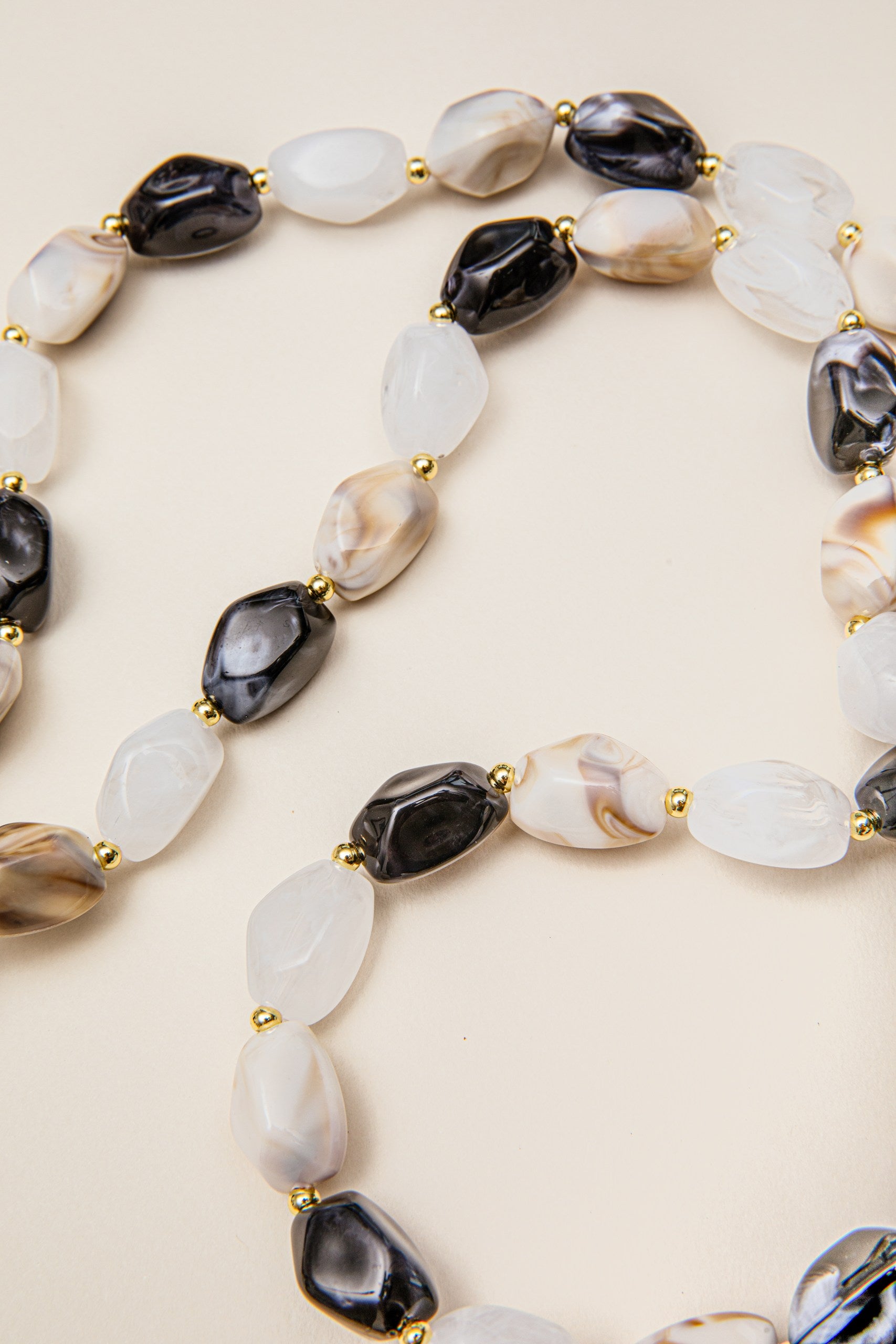 Cadena con piedras irregulares pequeñas con herrajes dorados. Largo de 120 cm.